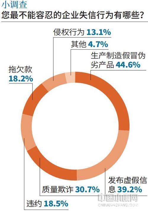 企业是市场的主体,也是维护社会信用的主体,企业信用一直都是公众关注的焦点之一。企业有哪些失信行为是公众无法容忍的?此次调查显示,受访者反映最多的是生产制造假冒伪劣产品,有44.6%的受访者直言对此无法容忍。其次是发布虚假消息,得票率为39.2%。再次是质量欺诈,30.7%的受访者选择了该选项。